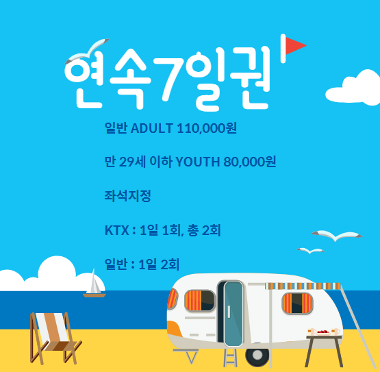 - KTX 7일권: 7일권은 일주일 동안 KTX를 무제한으로 이용할 수 있는 패스입니다. 장기 여행을 계획 중이라면 이 패스를 고려해 보세요. 7일 동안 전국의 주요 도시를 빠르고 편리하게 여행할 수 있으며, 여러 번의 이용에도 추가 비용이 발생하지 않으므로 매우 경제적입니다.