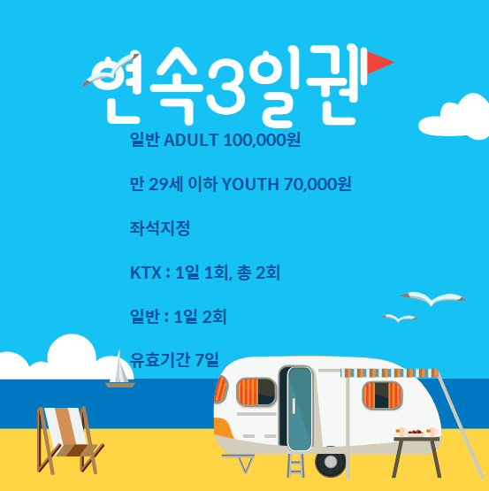 - KTX 3일권: 이 패스는 3일 동안 KTX를 무제한으로 이용할 수 있습니다. 주말 여행이나 단기 여행에 적합하며, 연속된 3일 동안 KTX티켓을 마음껏 이용할 수 있습니다. 가격은 상대적으로 저렴하며, 짧은 기간 내에 여러 지역을 여행하고자 하는 분들에게 추천합니다.